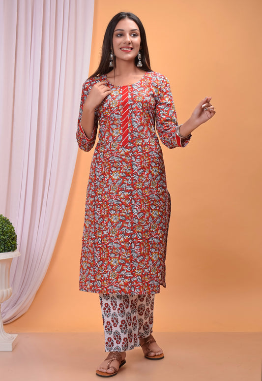 Printed Red Cotton Kurta and Palazzo Set